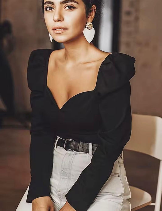 Special Offer Hot Sale Korean2019 autumn solid color vintage new women shirts puff sleeve square sexy small V-neck Slim blouse